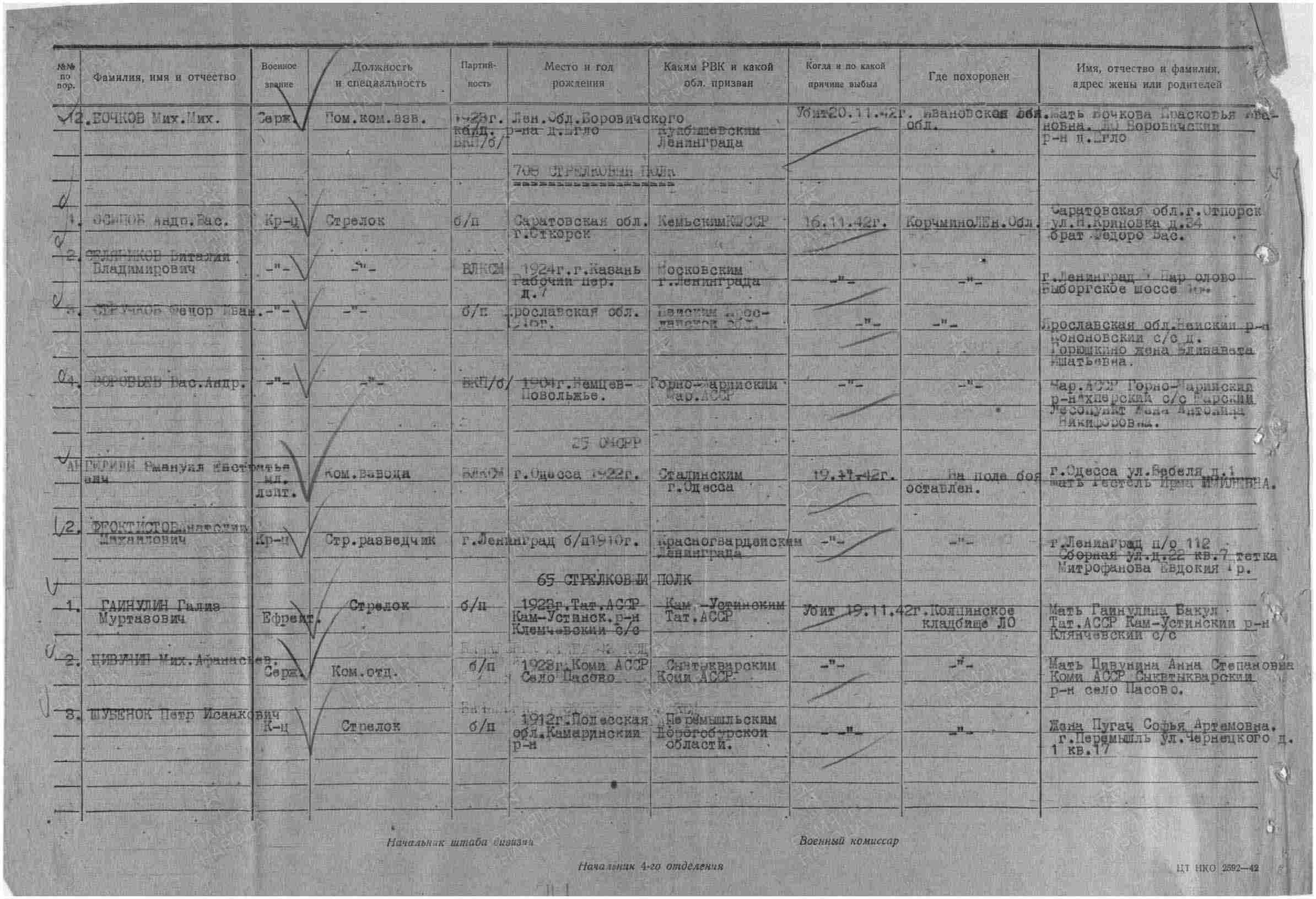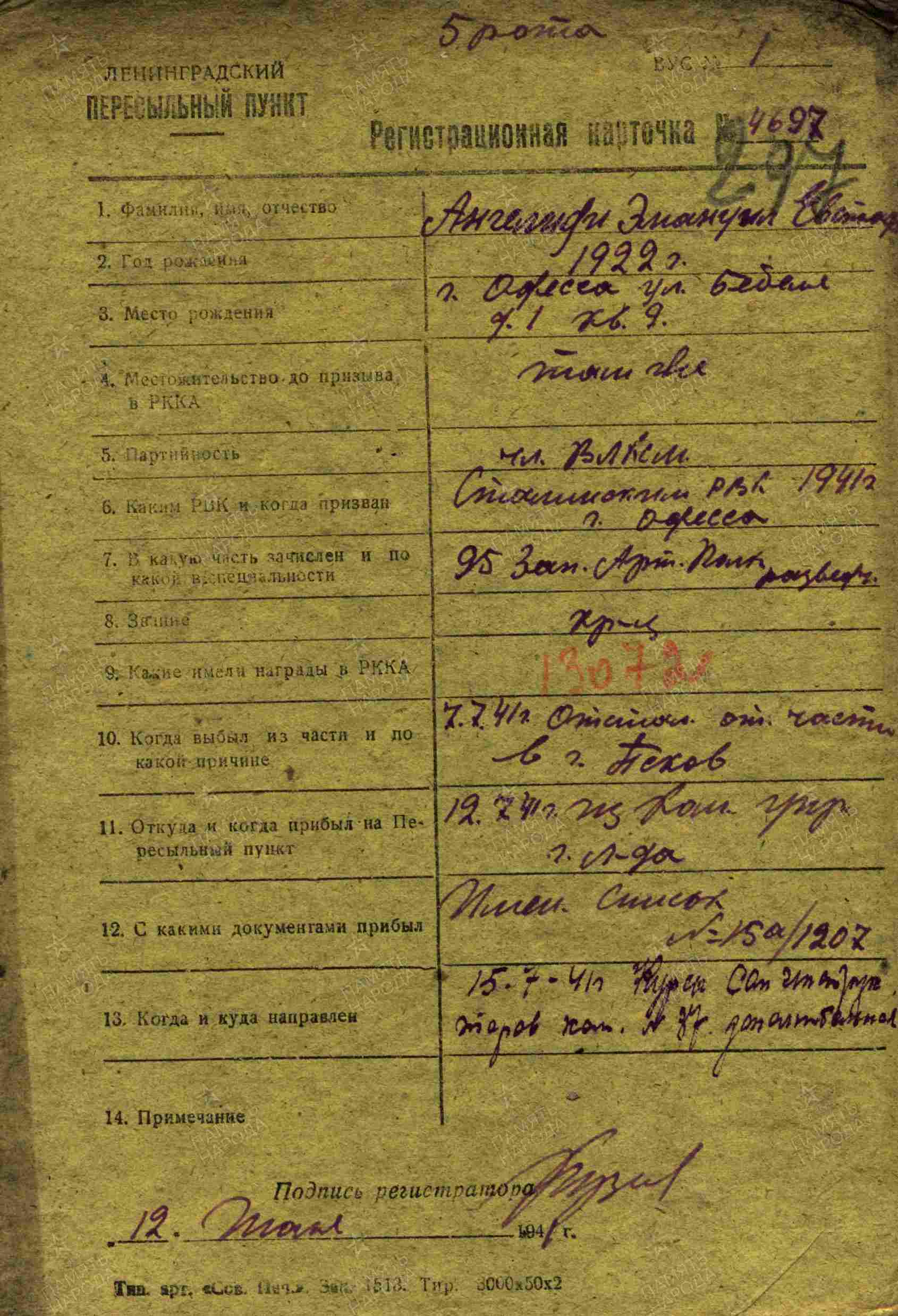 Наименование военкомата: Сталинский РВК, Украинская ССР, г. Одесса, Сталинский р-н