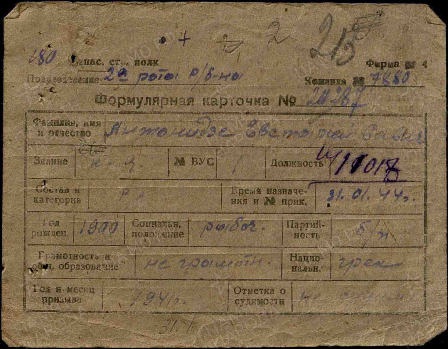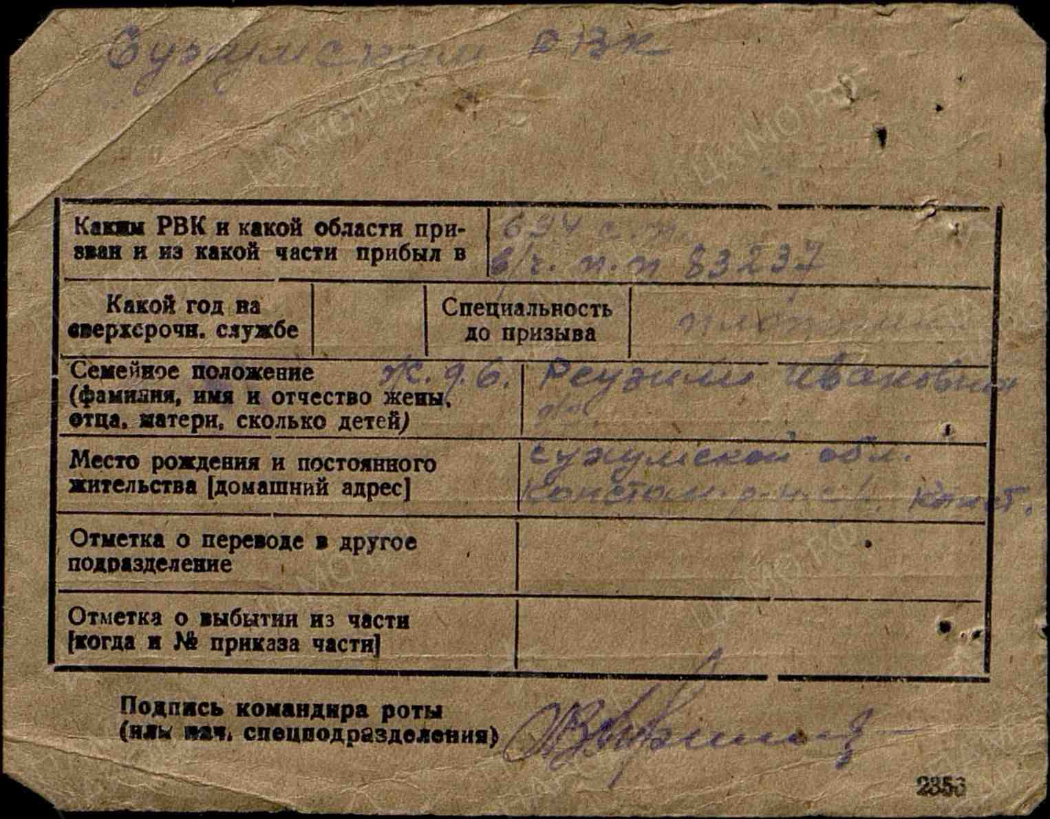 Наименование военкомата: Сухумский РВК, Грузинская ССР, Абхазская АССР, Сухумский р-н