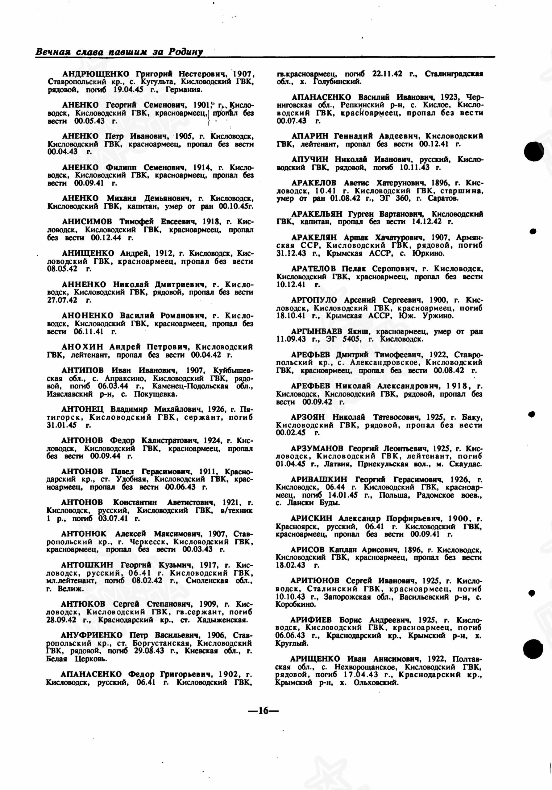 Наименование военкомата: Кисловодский ГВК, Орджоникидзевский край, г. Кисловодск