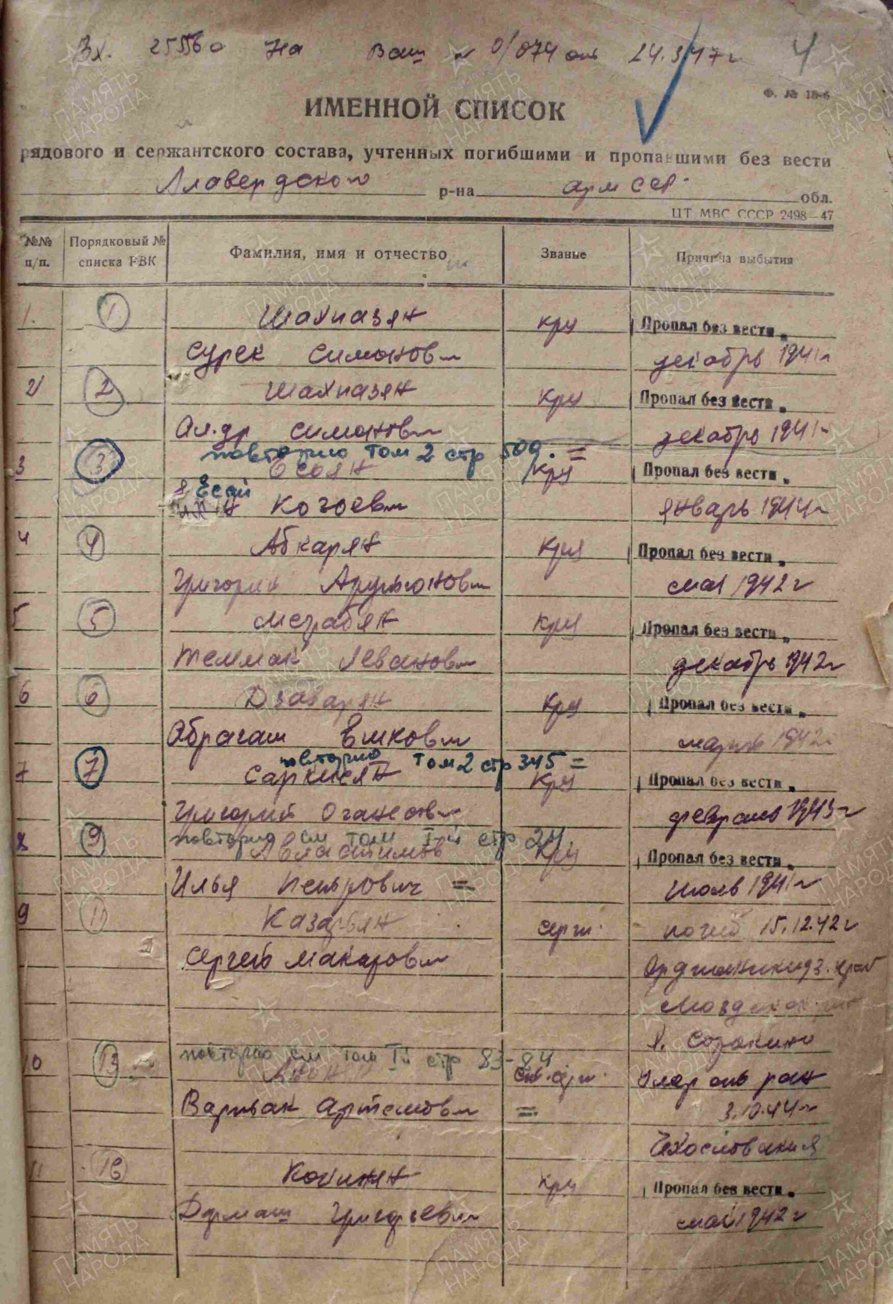 Место призыва: Алавердский РВК, Армянская ССР, Алавердский р-н