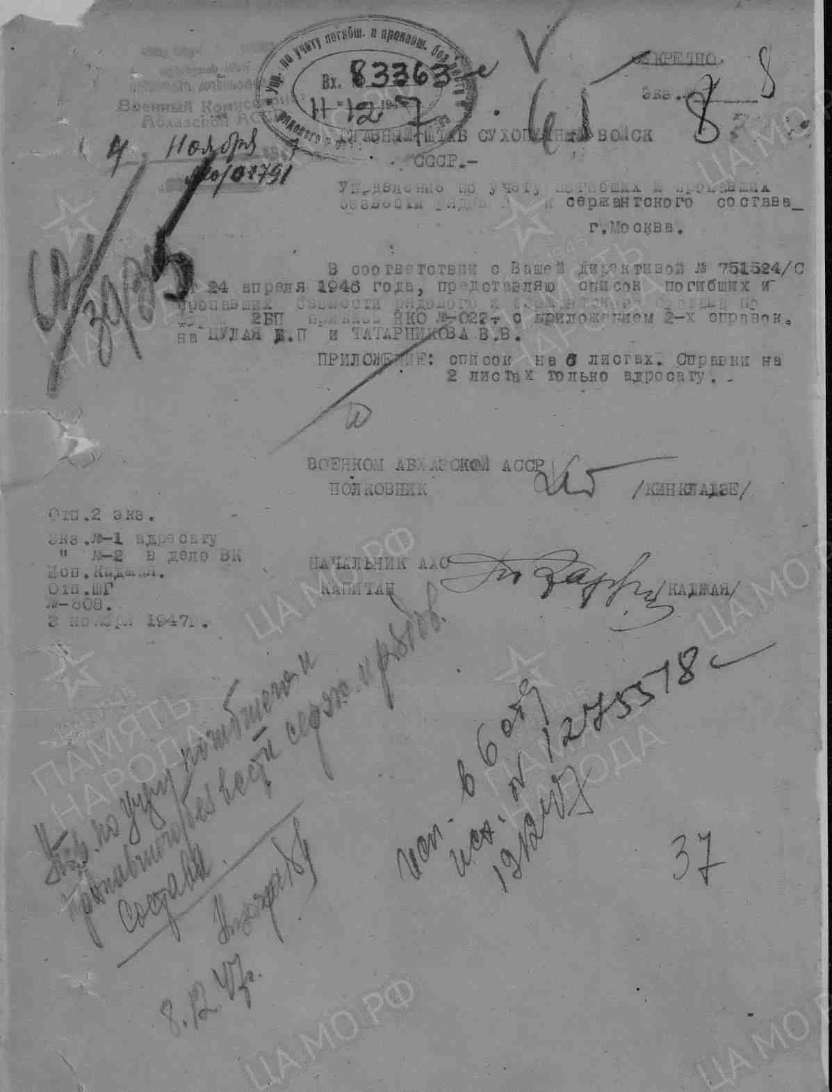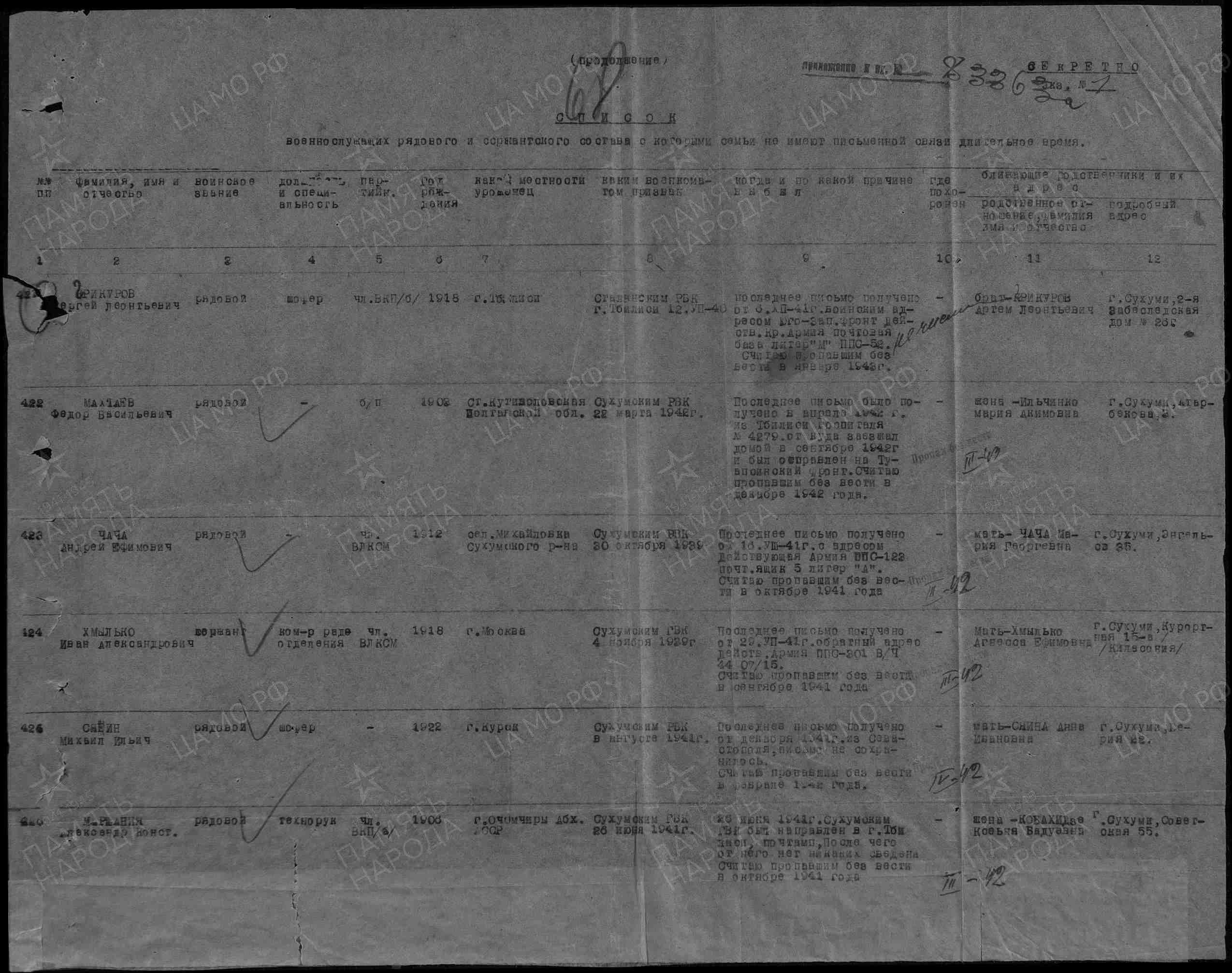 Наименование военкомата: Сухумский РВК, Грузинская ССР, Абхазская АССР, Сухумский р-н