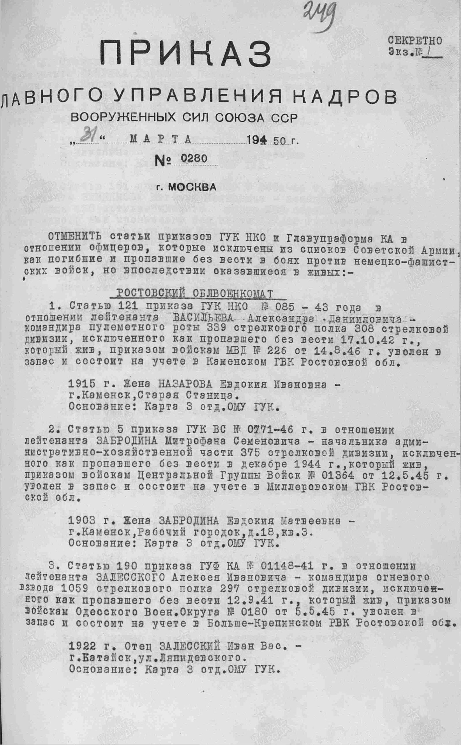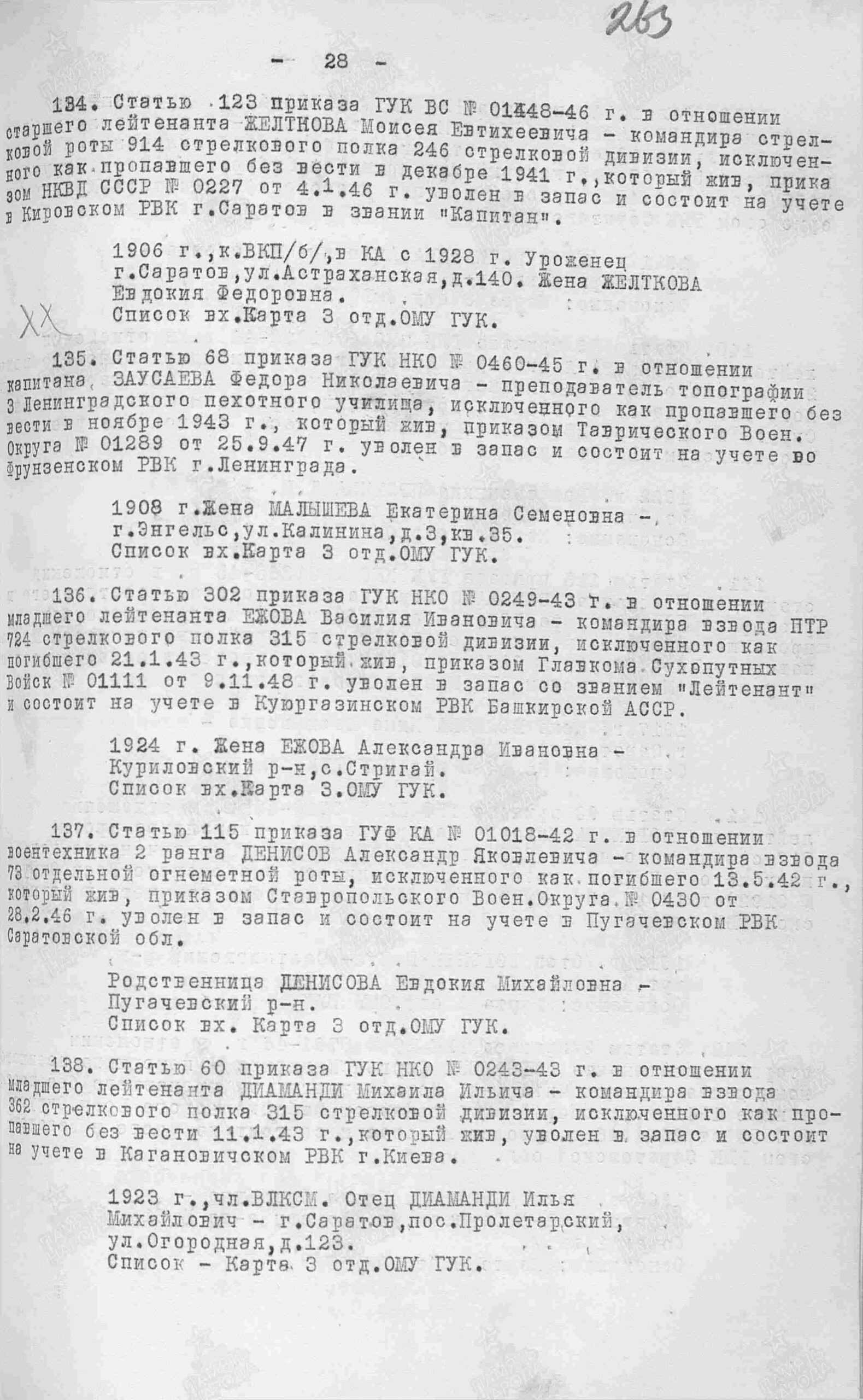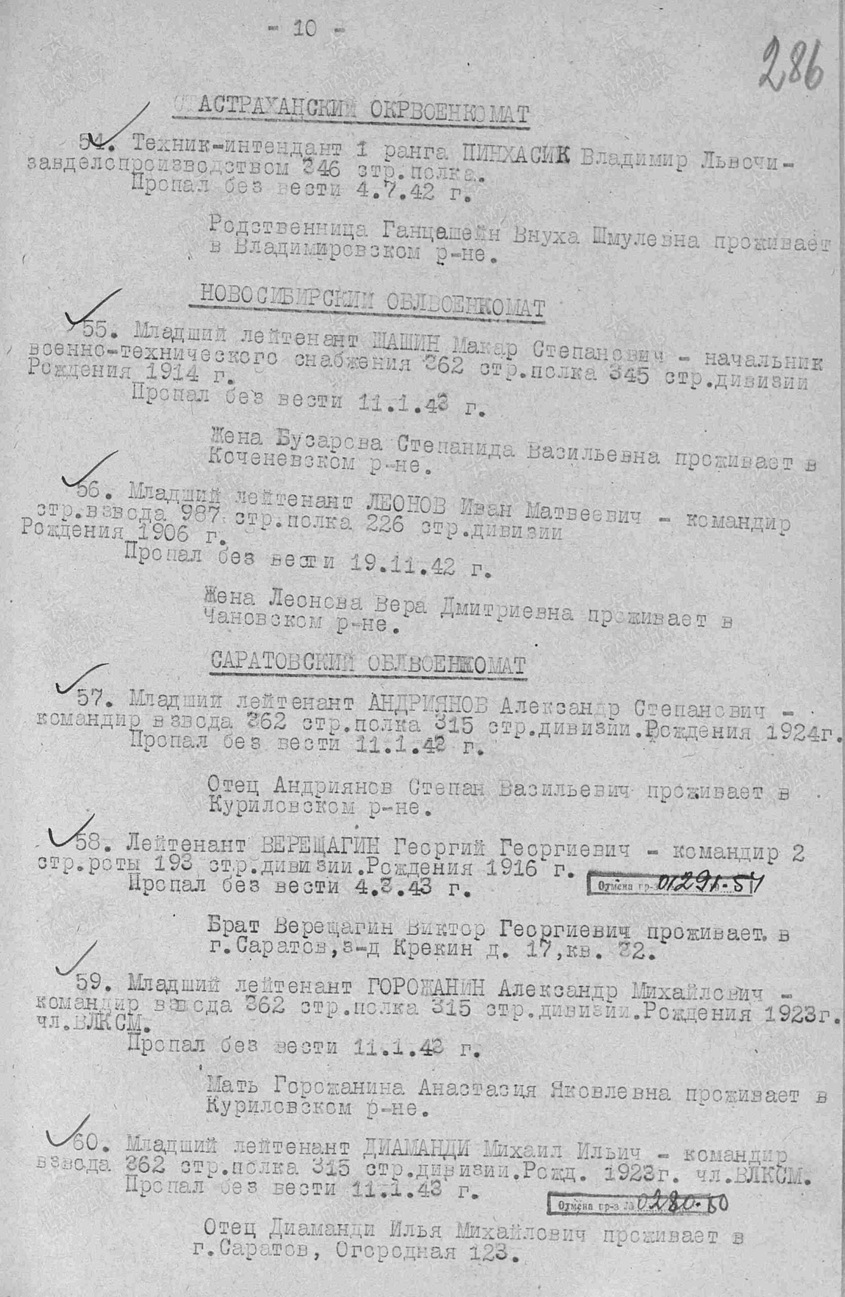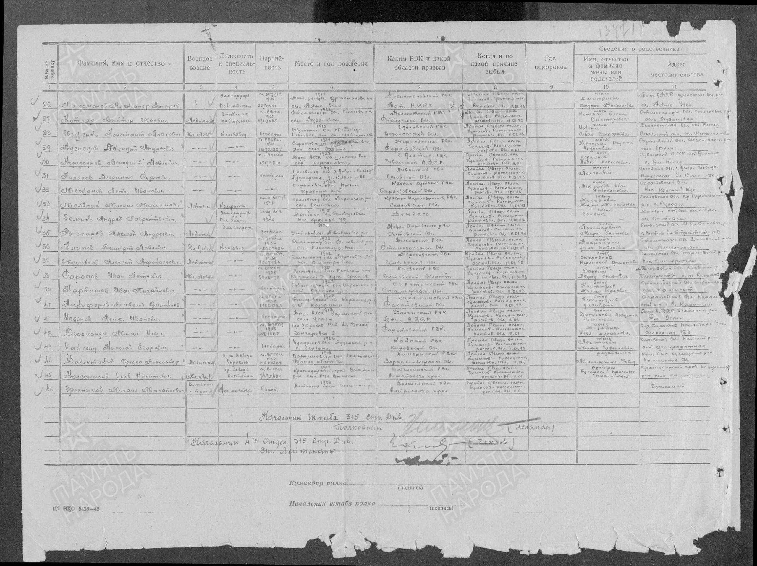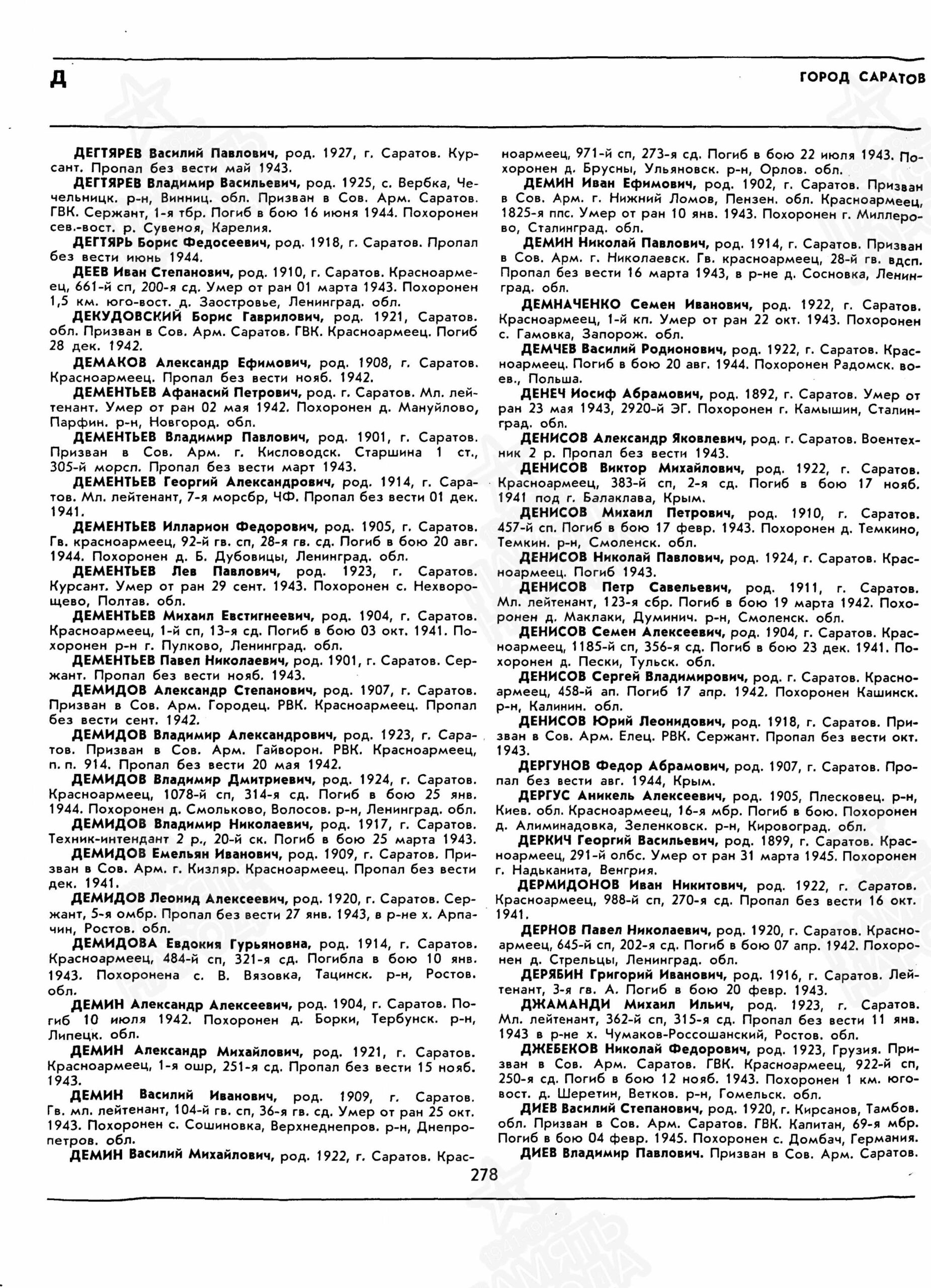Место призыва: Сталинский РВК, Саратовская обл., г. Саратов, Сталинский р-н