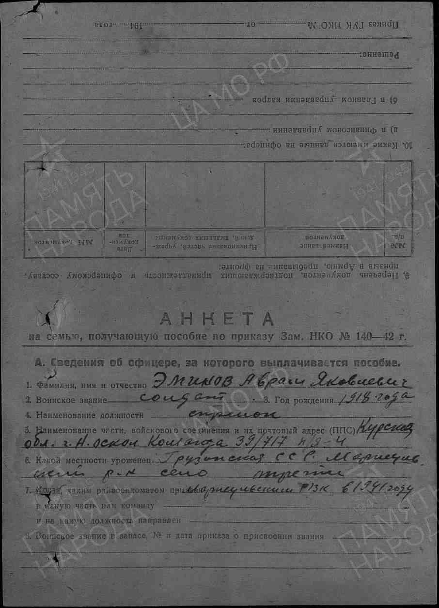 Место призыва: Борчалинский РВК, Грузинская ССР, Борчалинский р-н
