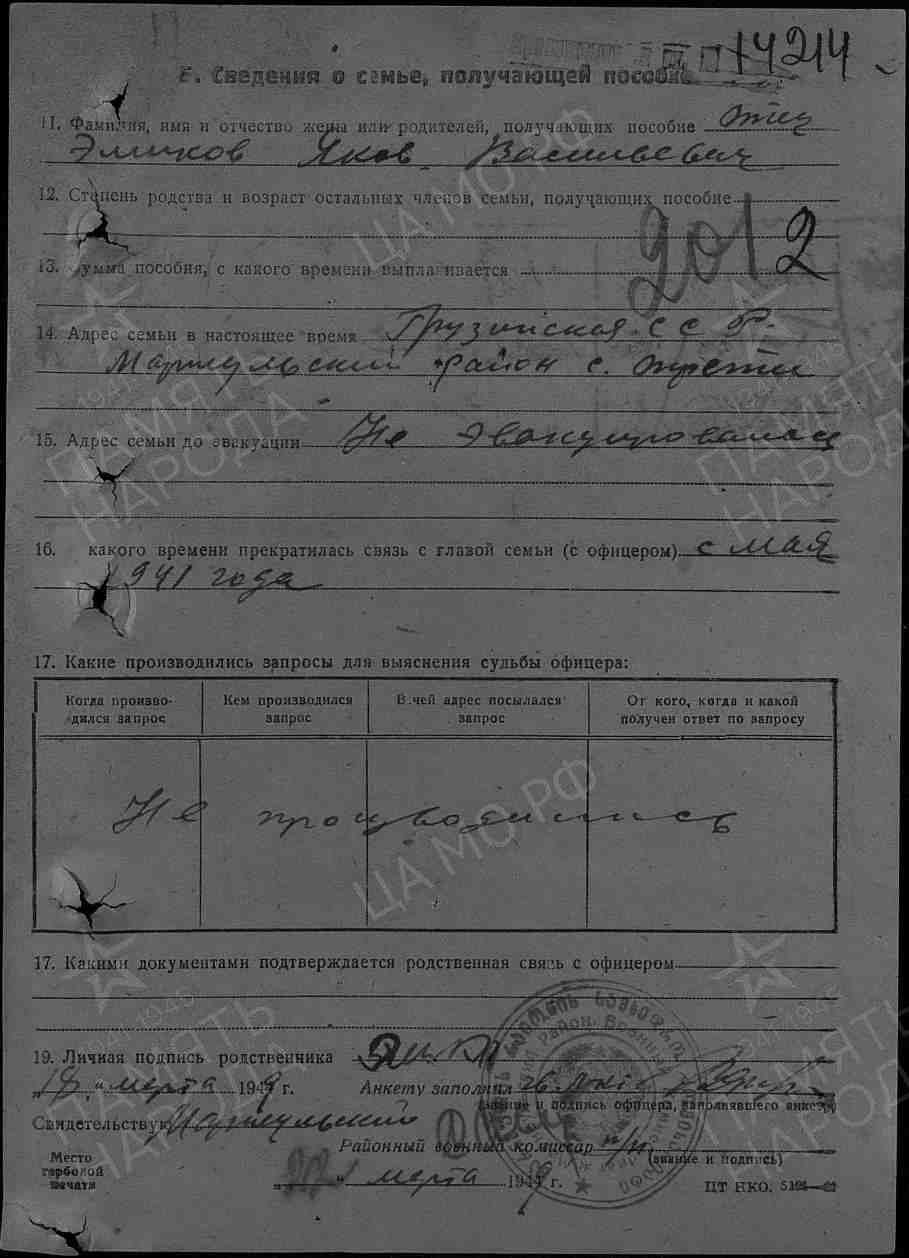 Дата и место призыва: __.__.1941 Мартеульский РВК, Грузинская ССР