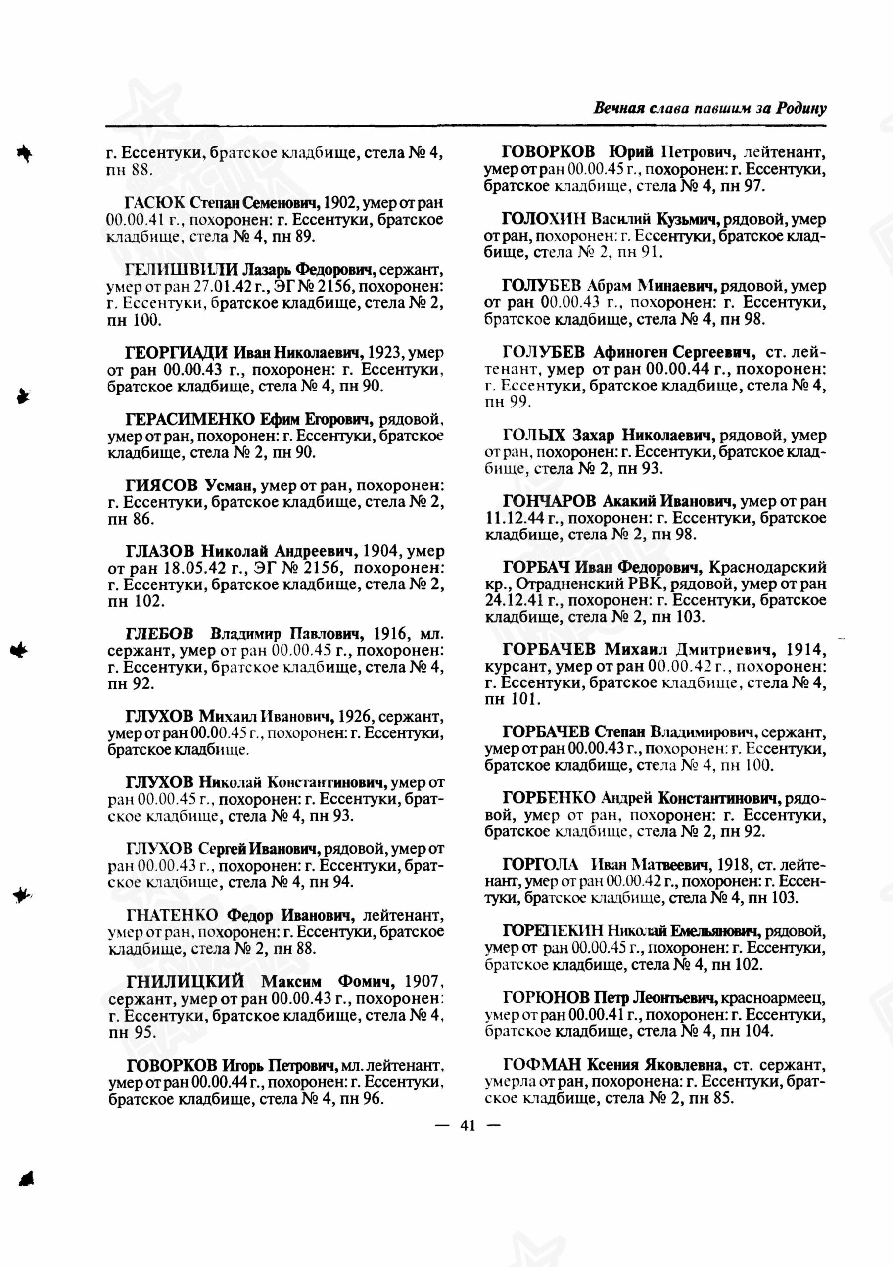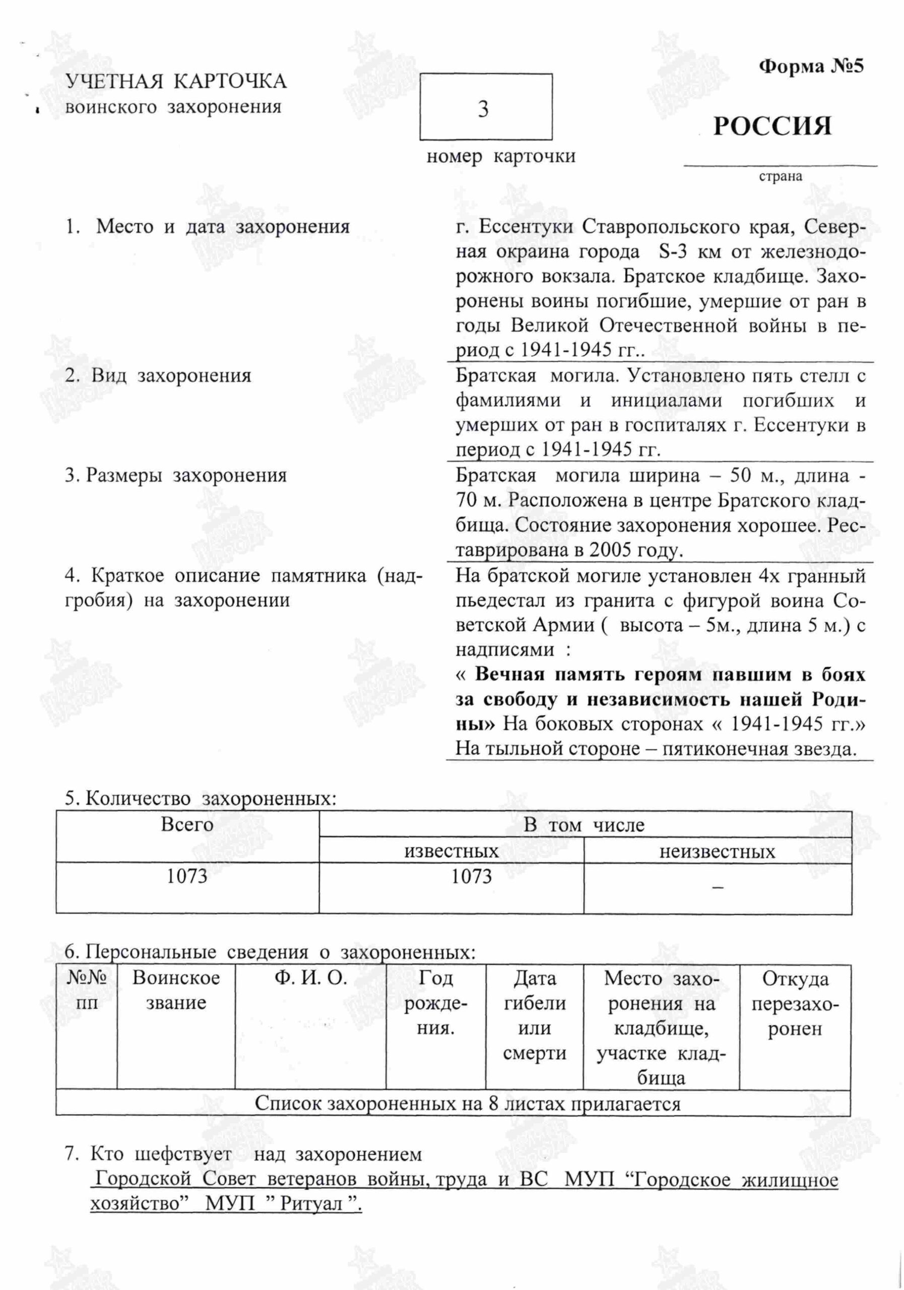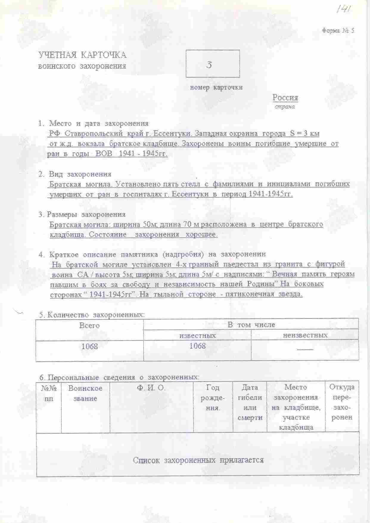 Место захоронения: г. Ессентуки, северная окраина, ж/д вокзал, 3 км, братское кладбище. Стелла № 4