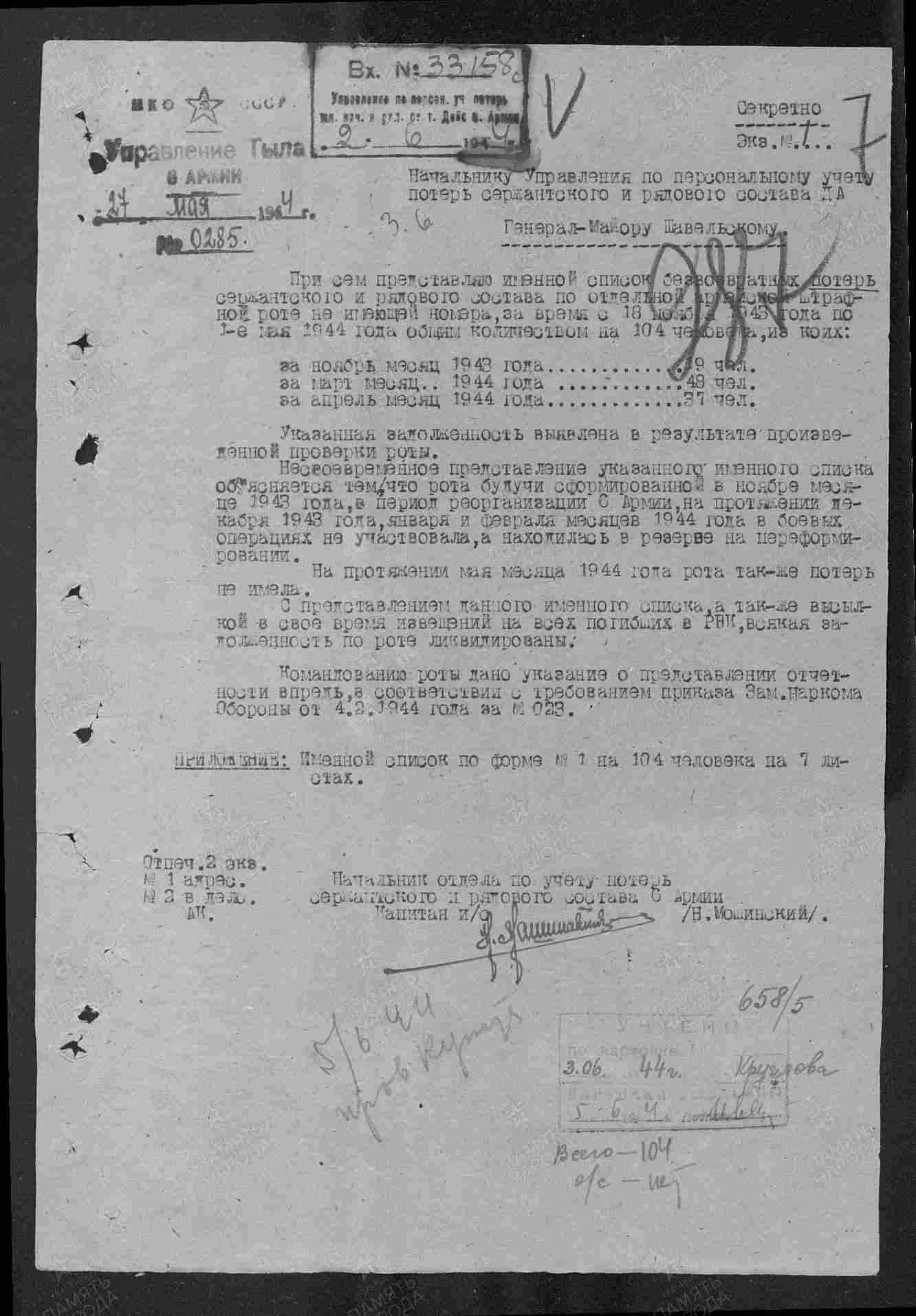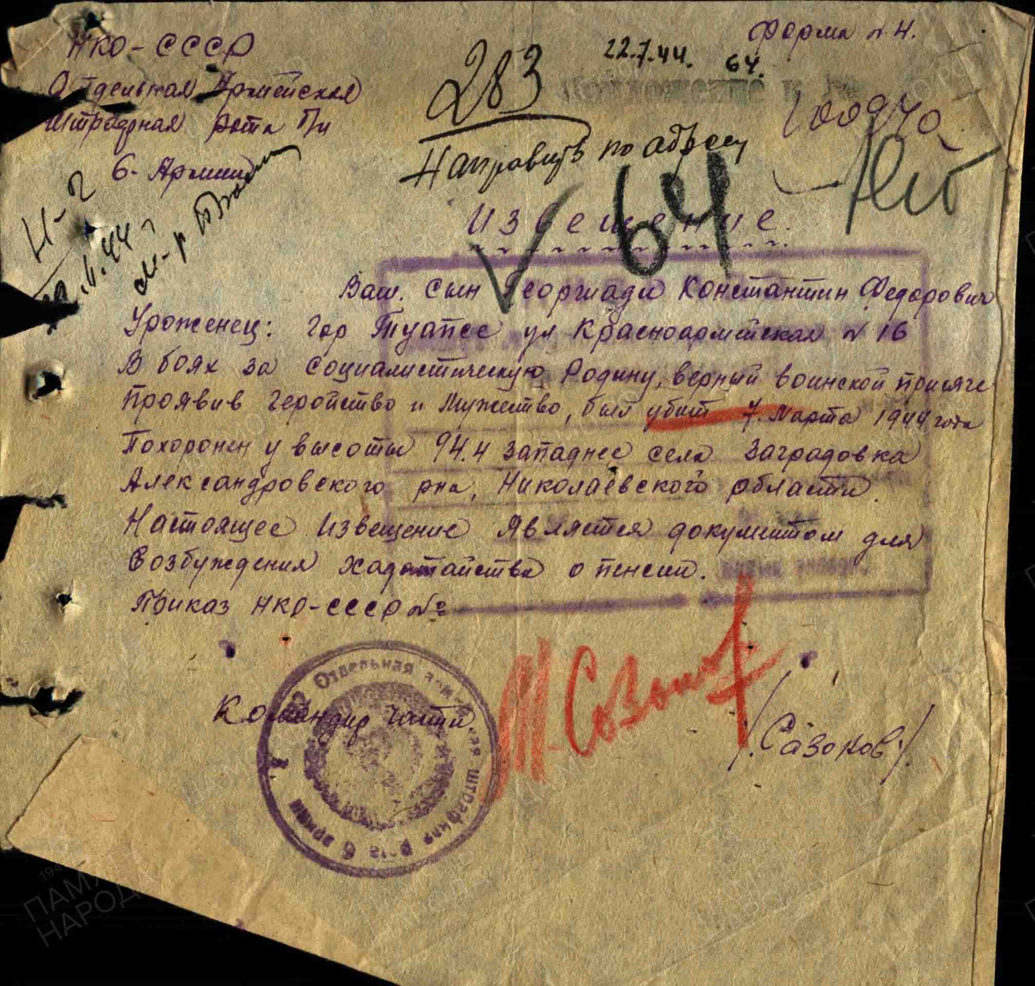 Первичное место захоронения: Украинская ССР, Николаевская обл., Больше-Александровский р-н, с. Заградовка, западнее, могила № 1