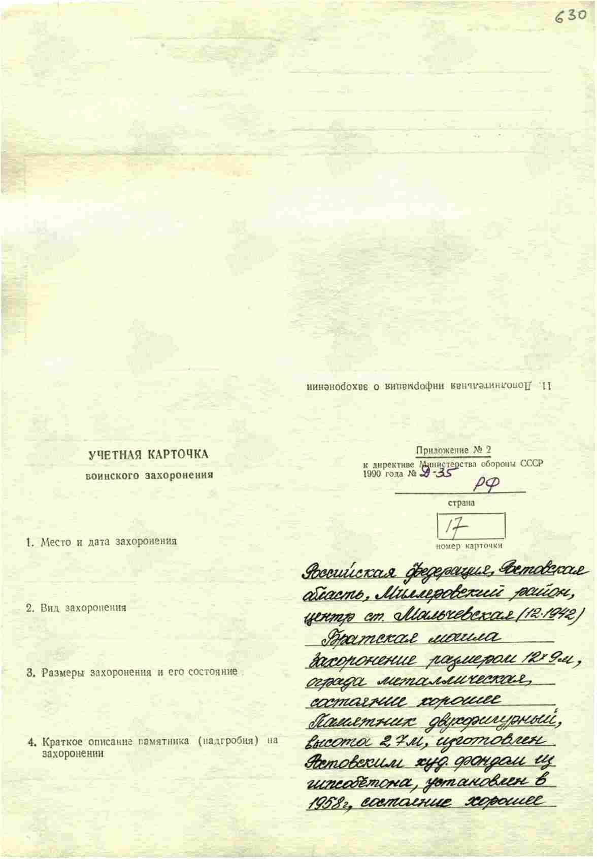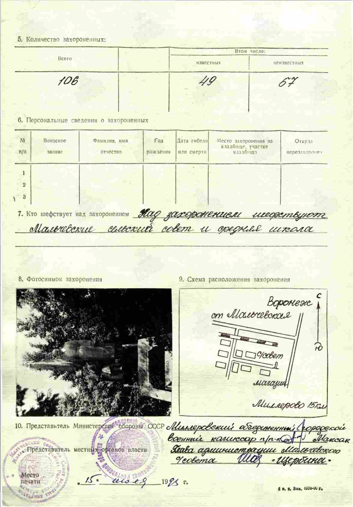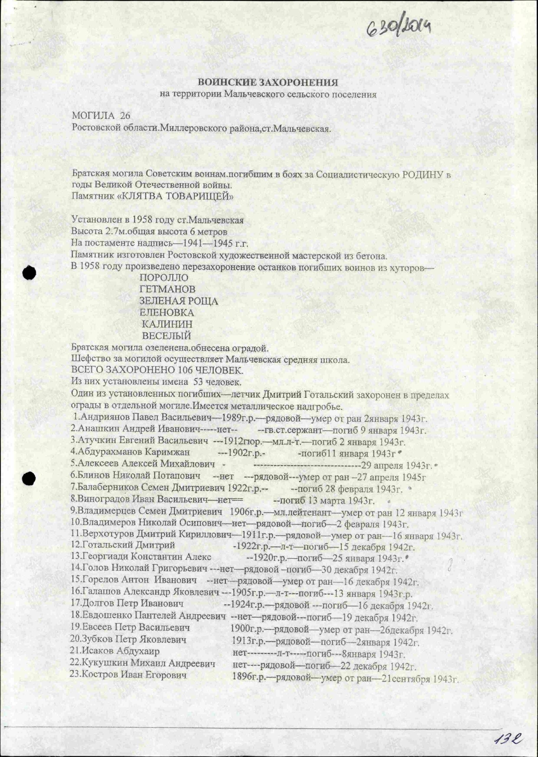 Место захоронения: Миллеровский р-н, ст. Мальчевская, могила 26 ; Миллеровский р-н, ст. Мальчевская, центр