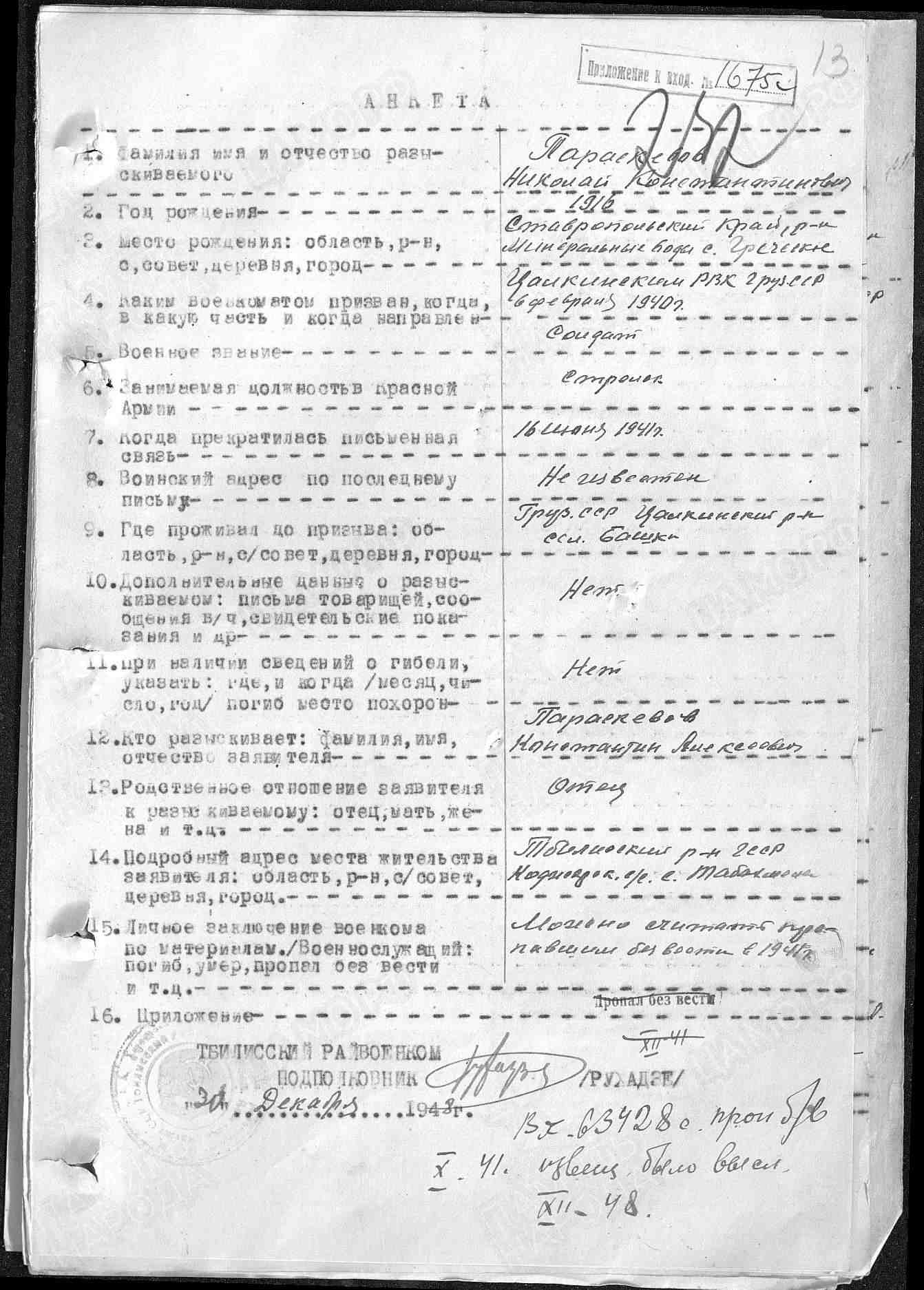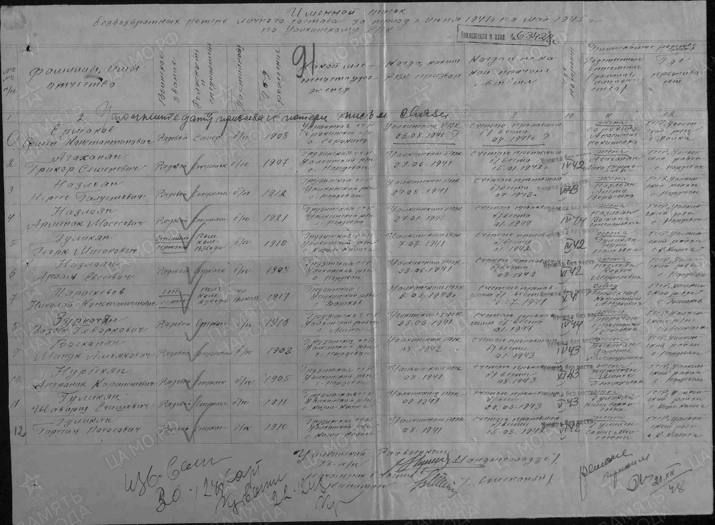 Наименование военкомата: Цалкинский РВК, Грузинская ССР, Цалкинский р-н
