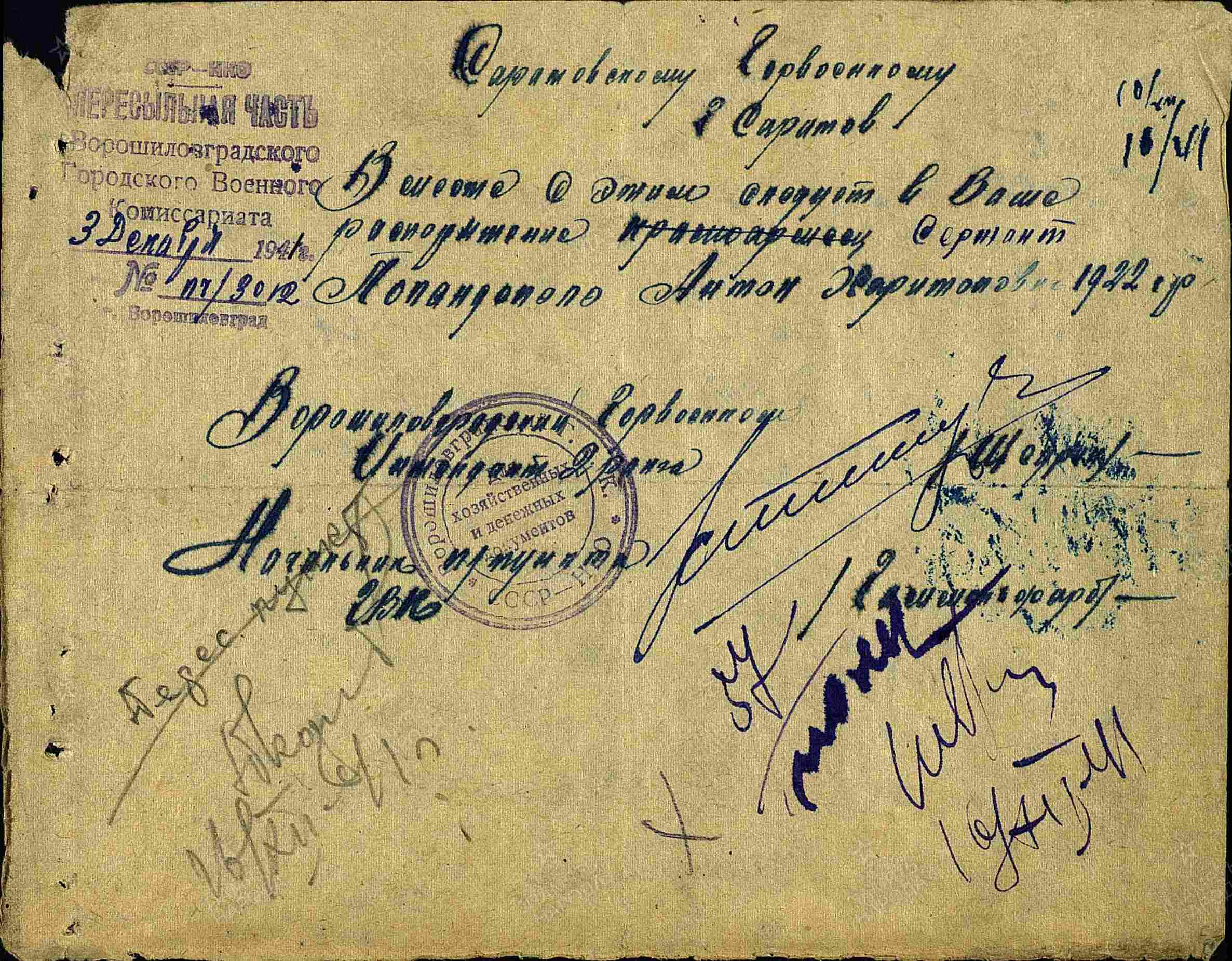 Место выбытия: Украинская ССР, Ворошиловградская обл.