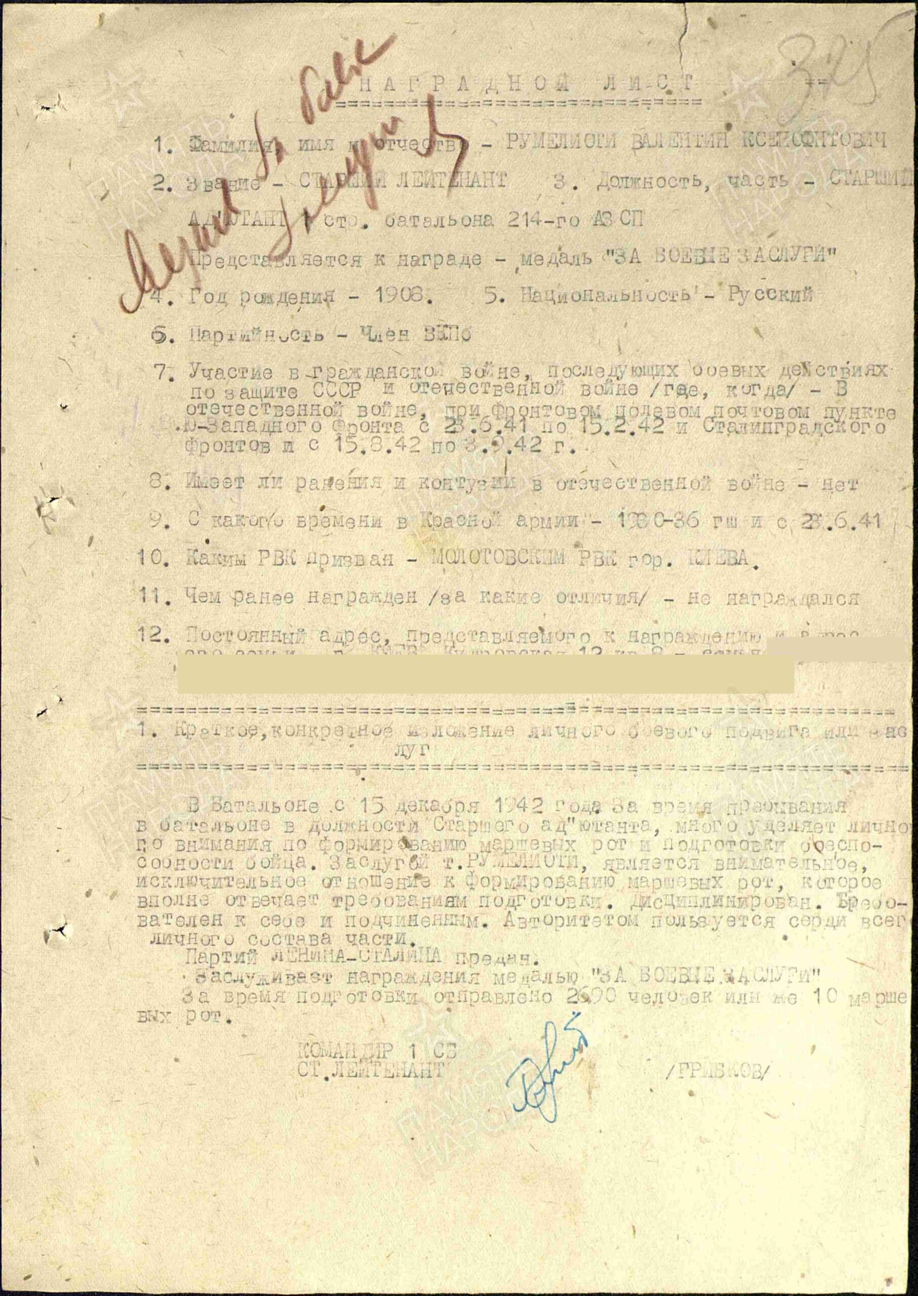 Место призыва: Молотовский РВК, Украинская ССР, Киевская обл., г. Киев, Молотовский р-н