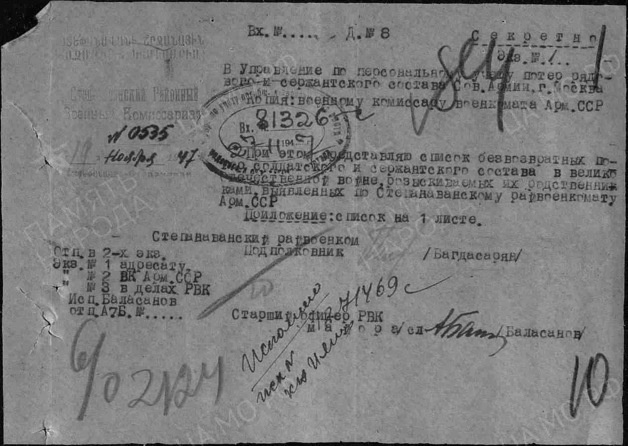Место призыва: Кироваканский РВК, Армянская ССР, Кироваканский р-н